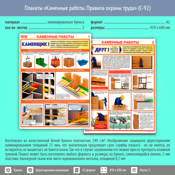 Плакаты «Каменные работы. Правила охраны труда» (С-92, ламинированная бумага, А2, 2 листа) в Санкт-Петербурге купить