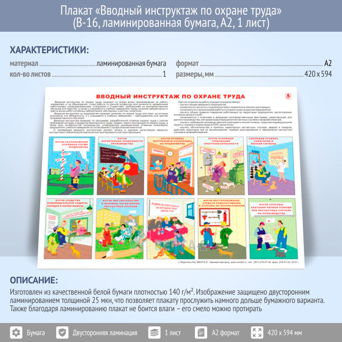 Плакат «Вводный инструктаж по охране труда» (В-16, ламинированная бумага, А2, 1 лист) в Санкт-Петербурге купить
