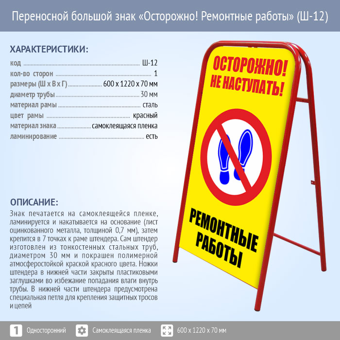 Переносной большой знак «Осторожно! Ремонтные работы» (Ш-12, односторонний, самоклеящаяся пленка) в Санкт-Петербурге купить
