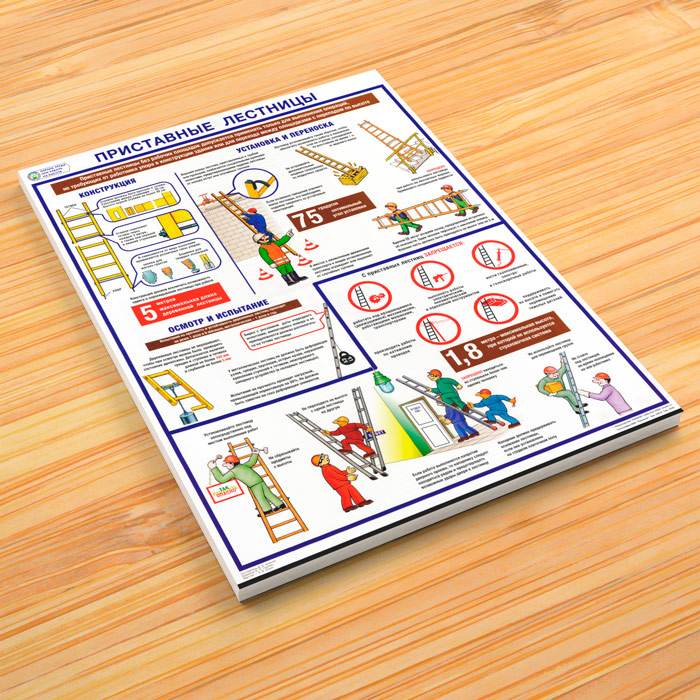 Плакат «Охрана труда при работе на высоте. Приставные лестницы» содержит информацию о правилах охраны труда и техники безопасности при выполнении работ на высоте с использованием приставных лестниц. Дана информация об устройстве лестниц, их правильной установки для ведения работ и способах переноски, осмотра и испытания. Также описываются приемы безопасной работы и виды работ, которые запрещено выполнять с приставных лестниц