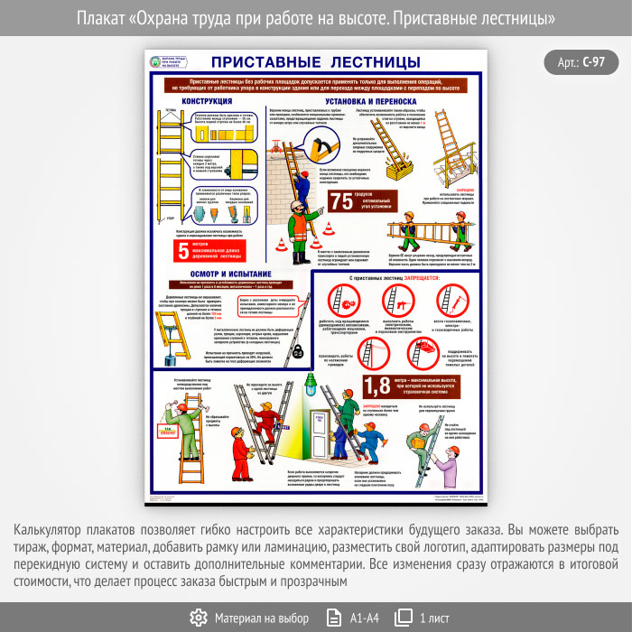 Плакат «Охрана труда при работе на высоте. Приставные лестницы» (С-97, 1 листа)