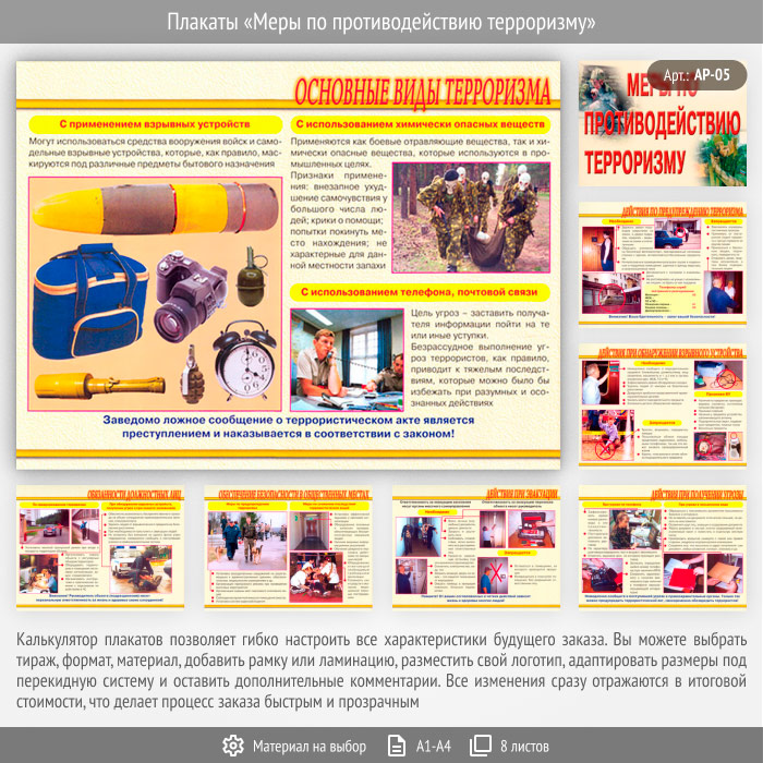 Комплект плакатов «Меры по противодействию терроризму» из 8 листов может быть изготовлен любого формата и размера, на бумаге, самоклеящейся пленке, пластике, баннерной ткани и металле. Разрабатываем, рисуем и изготавливаем плакаты на любую интересующую Вас тематику