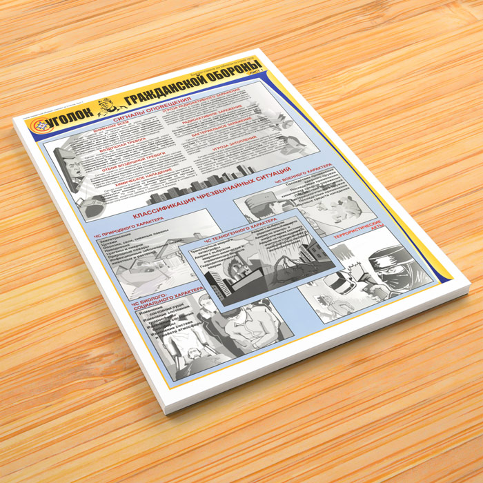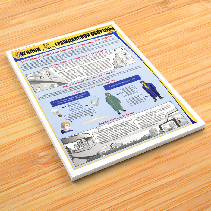 В комплекте плакатов из 3 листов «Уголок гражданской обороны» дается классификация стихийных бедствий, описываются сигналы гражданской обороны, действия персонала при возникновении ЧС, а также правила использования средств индивидуальной защиты