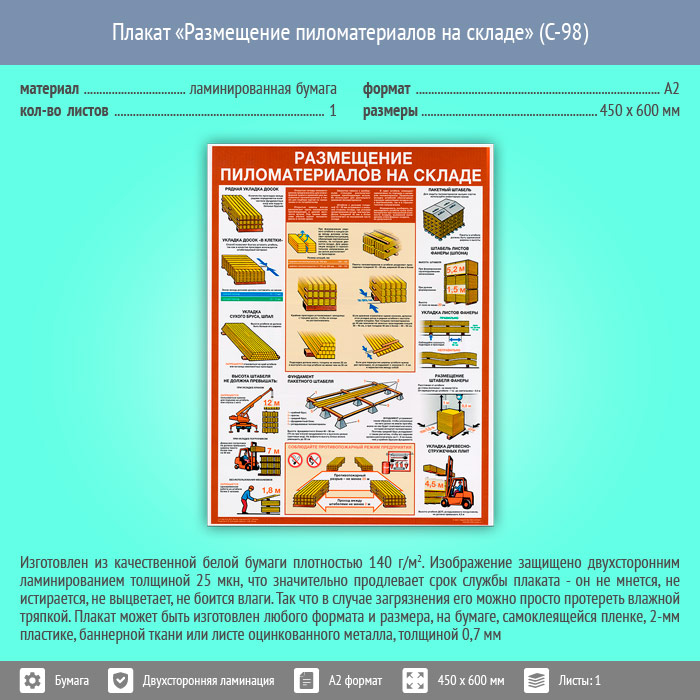 Плакат «Размещение пиломатериалов на складе» (С-98, ламинированная бумага, А2, 1 лист) в Санкт-Петербурге купить