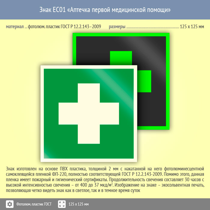 Знак EC01 «Аптечка первой медицинской помощи» (фотолюминесцентный пластик ГОСТ 34428-2018, 125х125 мм) в Санкт-Петербурге купить