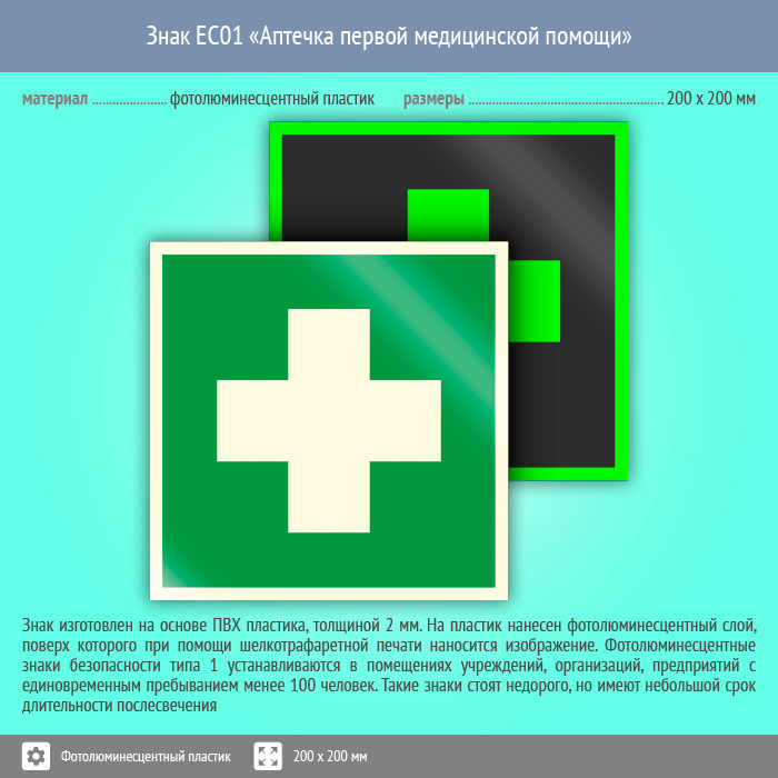 Знак EC01 «Аптечка первой медицинской помощи» (фотолюминесцентный пластик, 200х200 мм) в Санкт-Петербурге купить