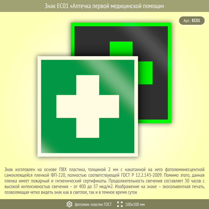 Знак EC01 «Аптечка первой медицинской помощи» (фотолюминесцентный пластик ГОСТ 34428-2018, 100х100 мм) в Санкт-Петербурге купить